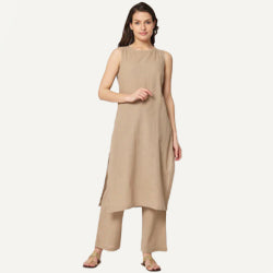 Beige Collar Neck Mid Length Solid Co-ord Set