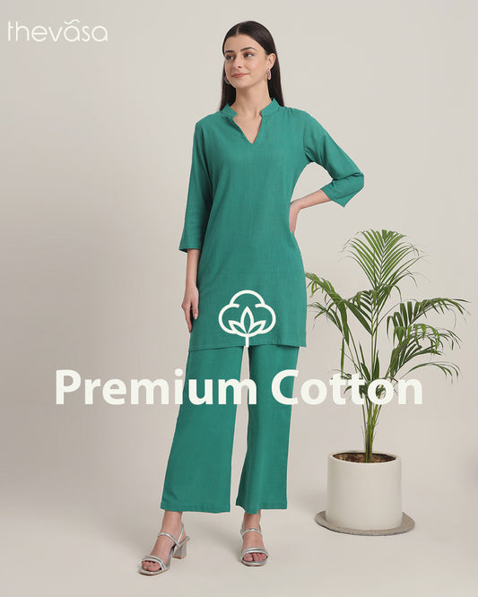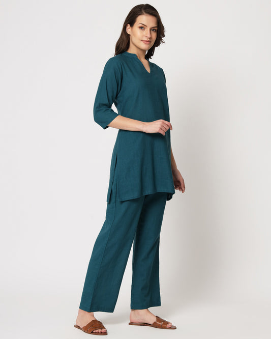 Deep Teal Collar Neck Mid Length Solid Kurta (Without Bottoms)