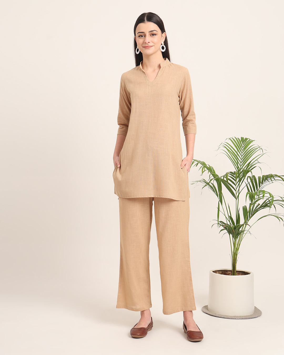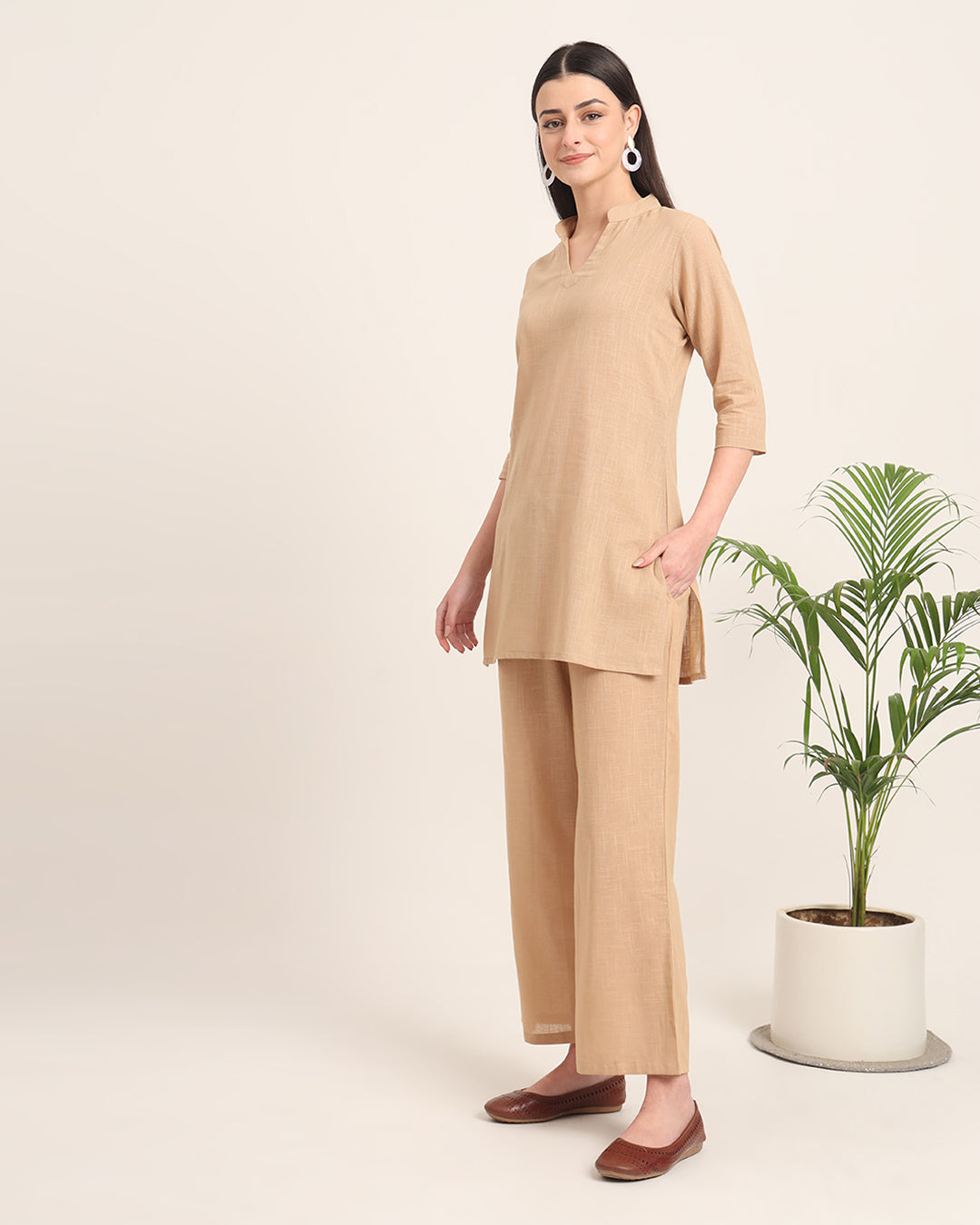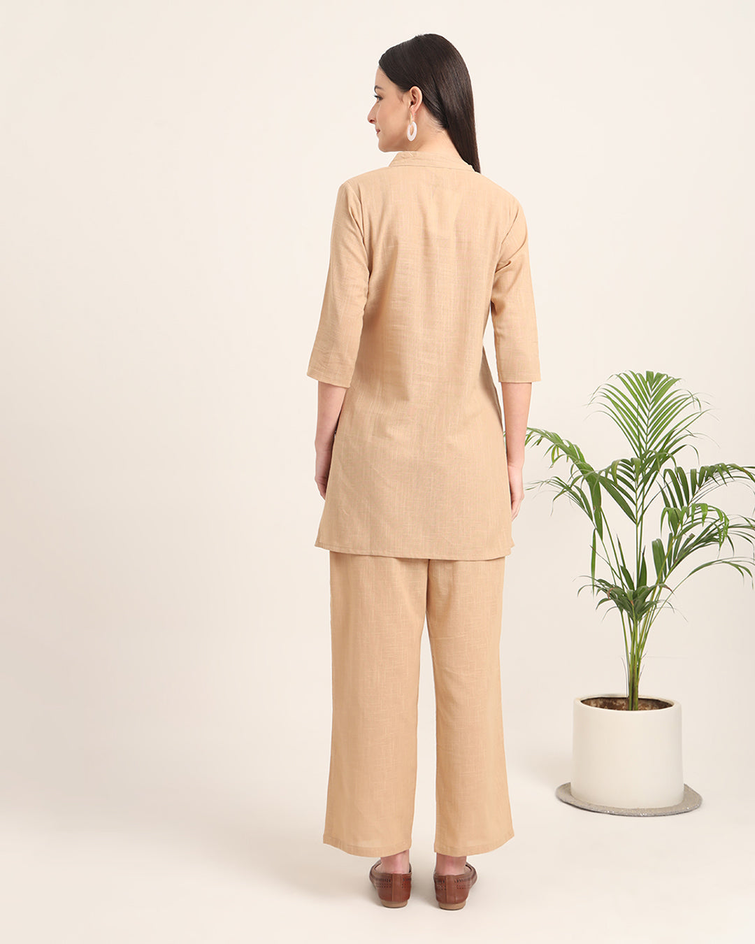Beige Collar Neck Mid Length Solid Co-ord Set