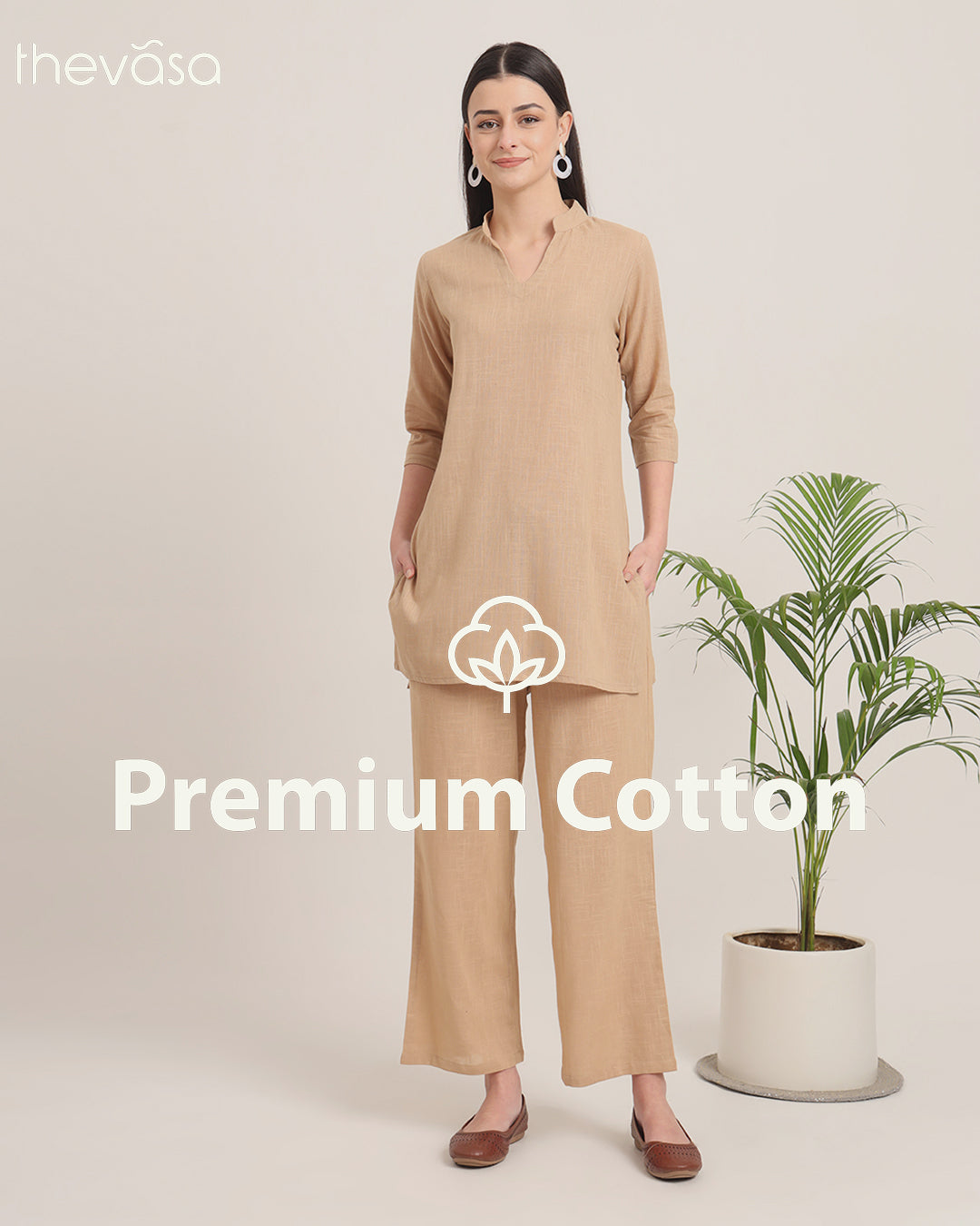 A pair of well finished straight pants along with a short length Kurta is a must-have for the coming season. The premium quality cotton fabric adds greater comfort to this masterfully crafted Co-ord set. Made in an extremely versatile and universally flattering coffee toned beige colour.