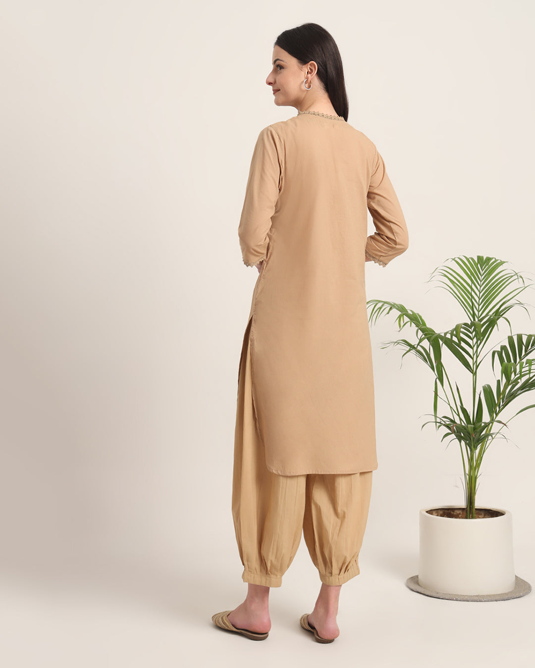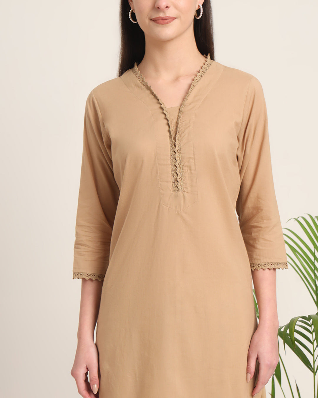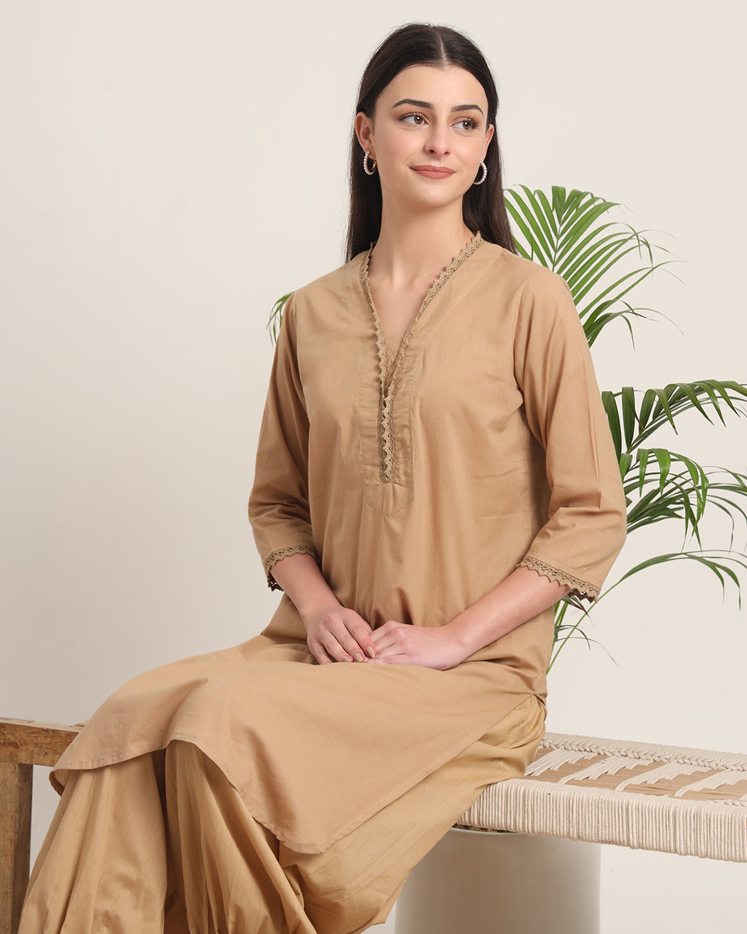 A simplistic Co-ord set, inclusive of a pair of cotton Salwars and a cotton Kurta with lace details, is the ideal choice for the hot summer months. This well-crafted set is made in a neutral beige tone that will surely bring more versatility to your closet.