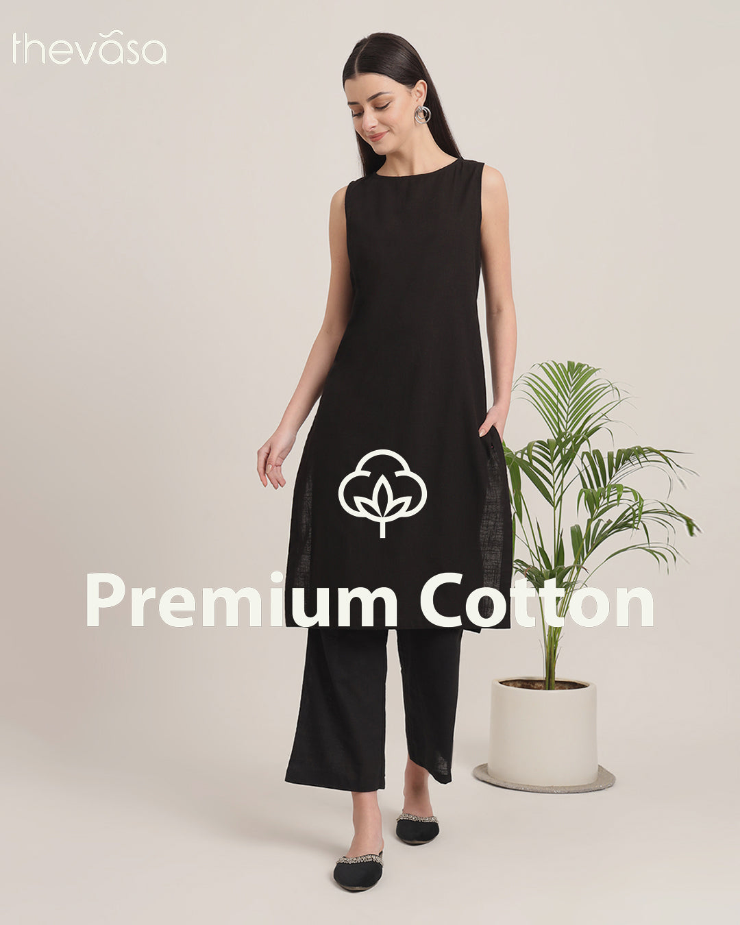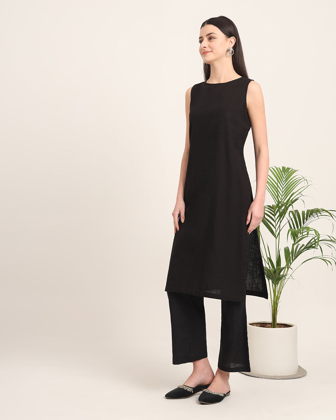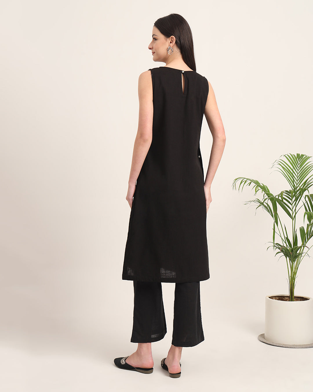 A simple round neck, a sleeveless silhouette and functional side button details, are the key features of this piece. The charming knee length Kurta comes with a well sewn pair of straight pants. This classy Co-ord set has been crafted in a true black colour, that will never go out of style.
