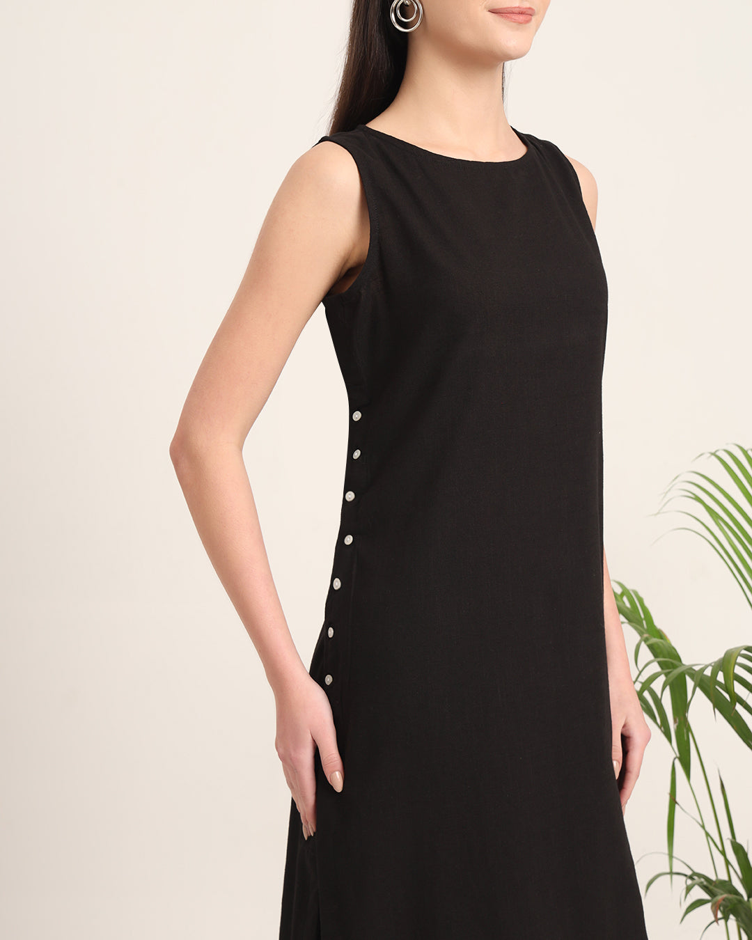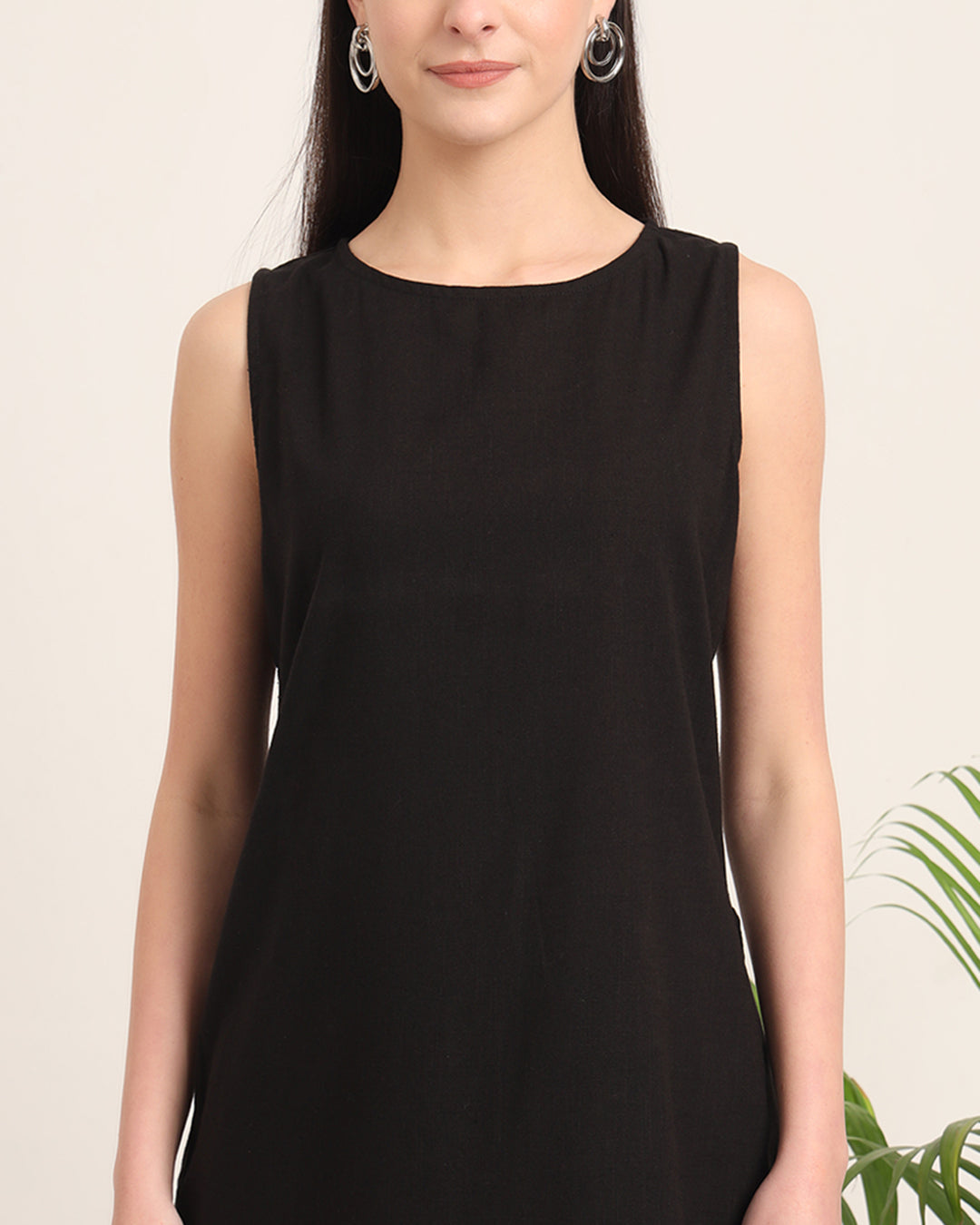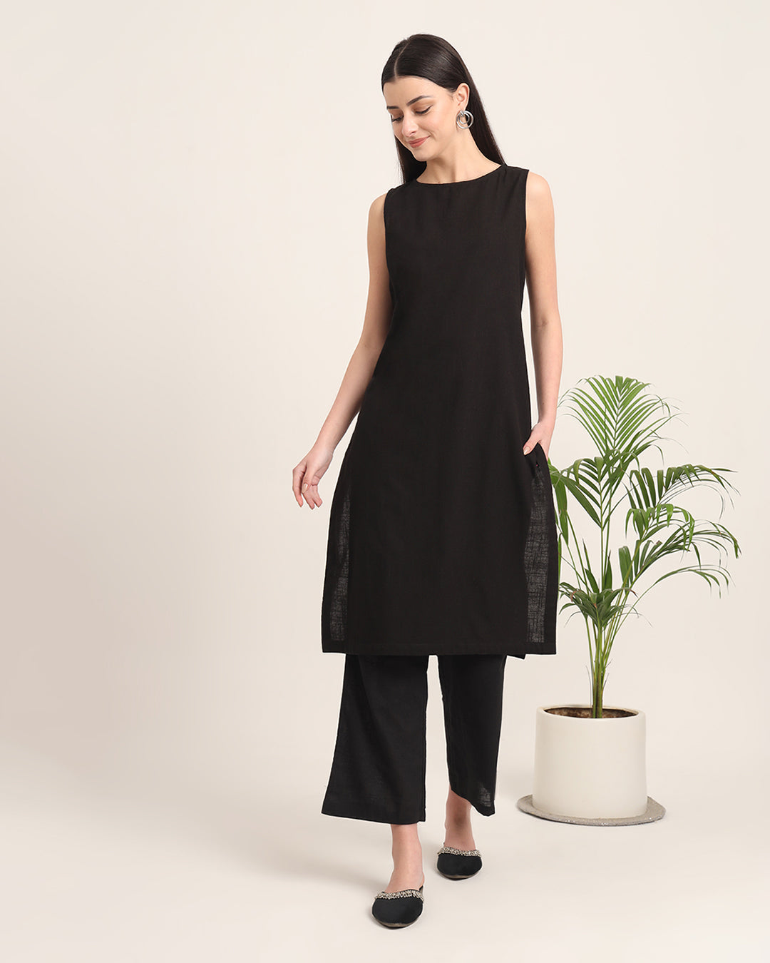 A simple round neck, a sleeveless silhouette and functional side button details, are the key features of this piece. The charming knee length Kurta comes with a well sewn pair of straight pants. This classy Co-ord set has been crafted in a true black colour, that will never go out of style.