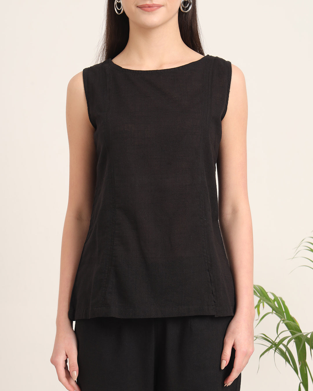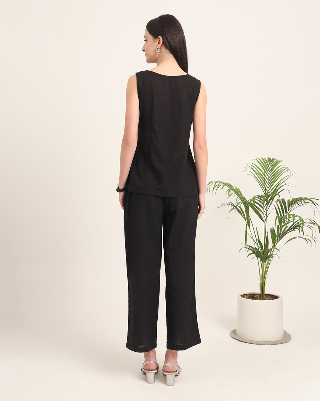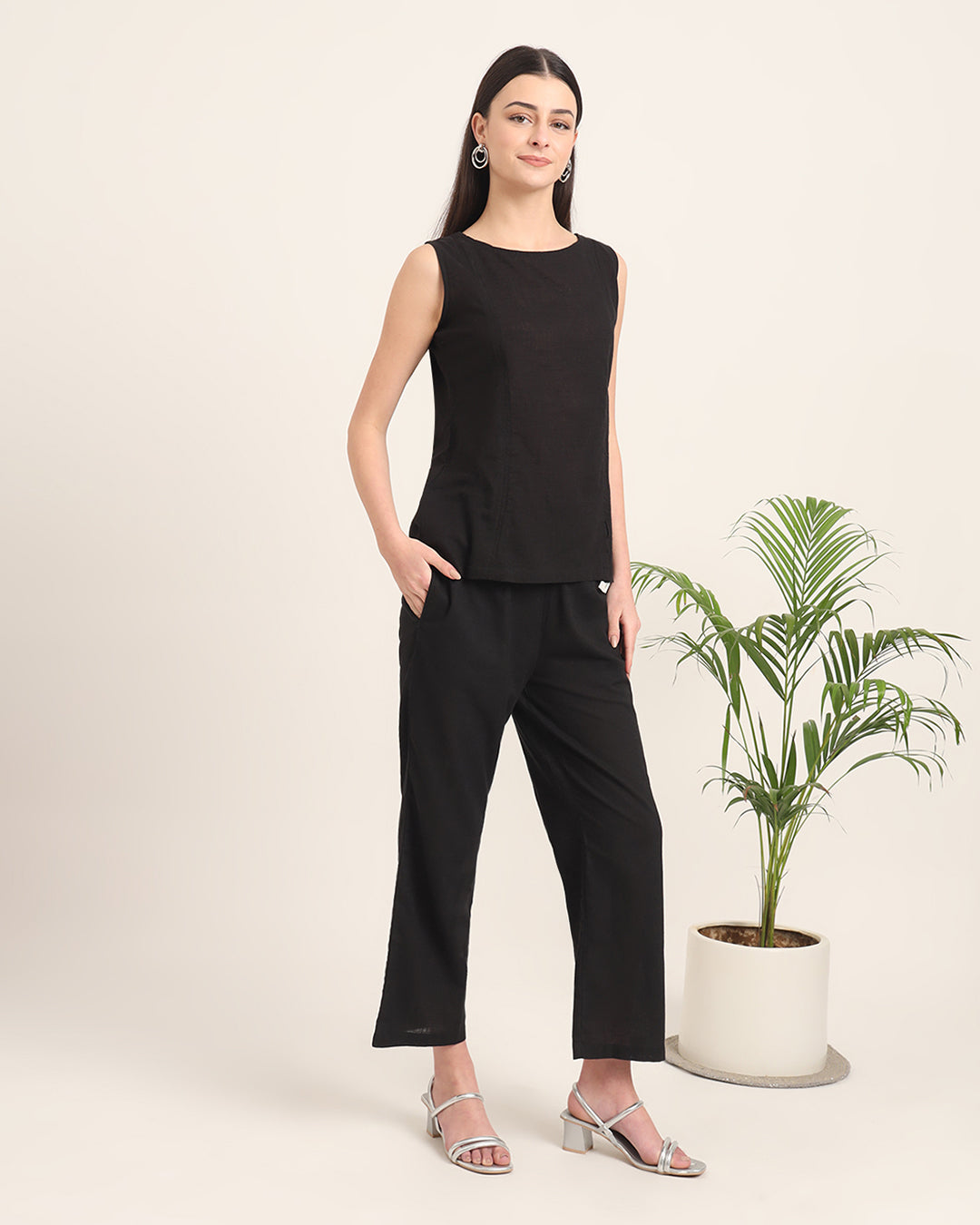 A pure black shade is always in vogue, and you can never go wrong with a pair of well stitched pieces in this colour. Moreover, this Co-ord set has been crafted with the choicest of cotton fabrics, to beat the summer heat. Featuring a simple round neckline as well as a sleeveless silhouette, along with a pair of straight pants.
