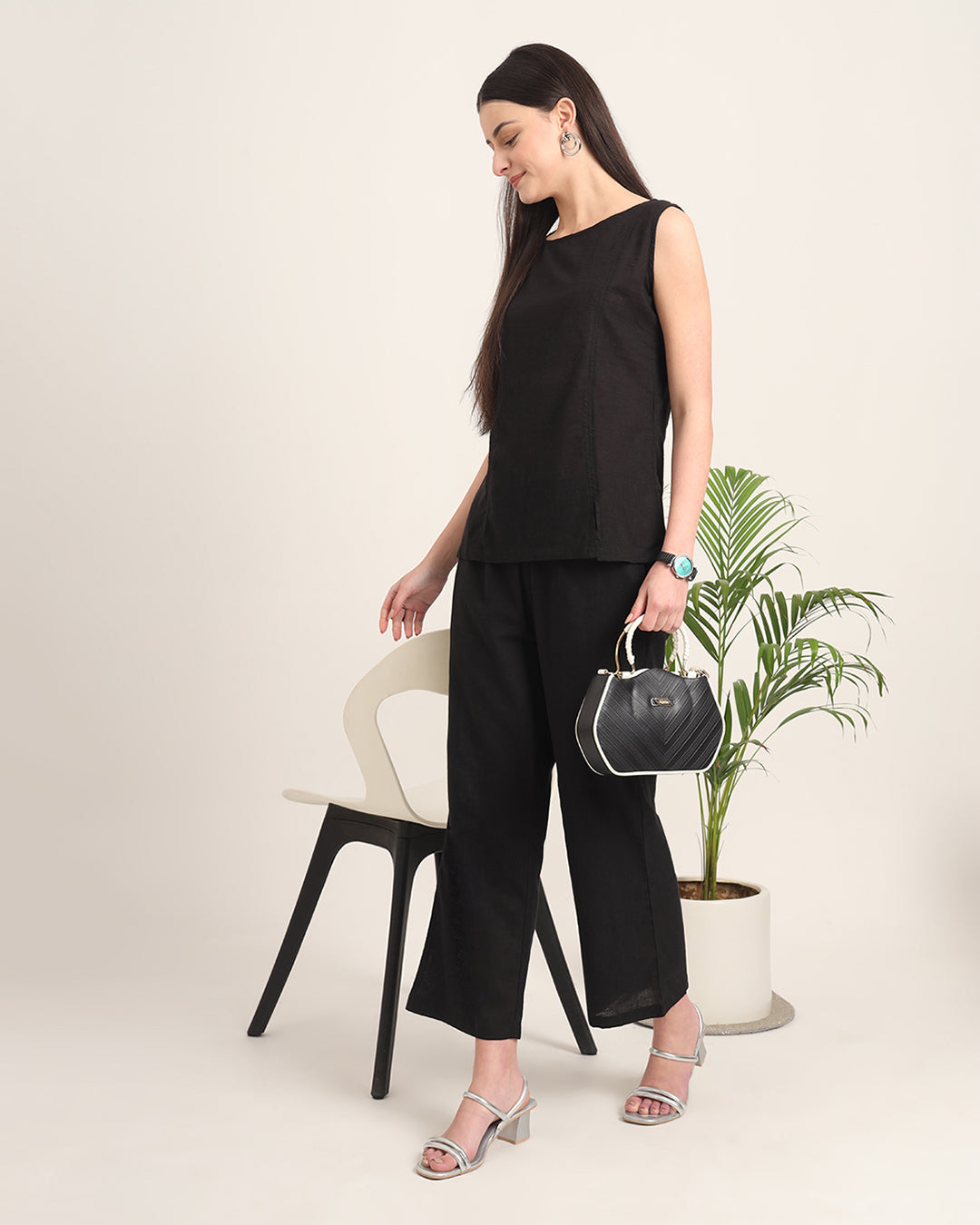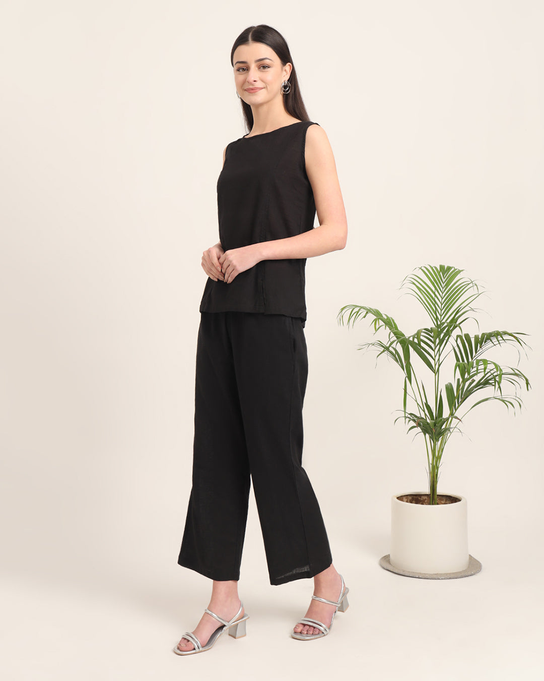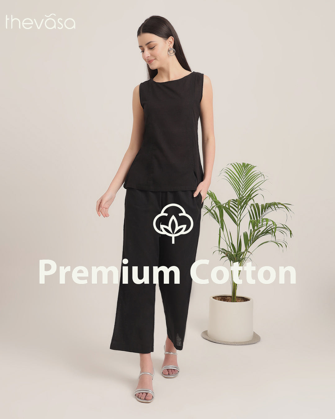 A pure black shade is always in vogue, and you can never go wrong with a pair of well stitched pieces in this colour. Moreover, this Co-ord set has been crafted with the choicest of cotton fabrics, to beat the summer heat. Featuring a simple round neckline as well as a sleeveless silhouette, along with a pair of straight pants.