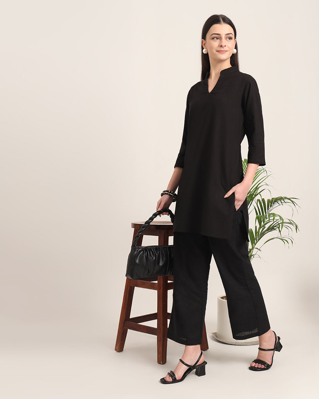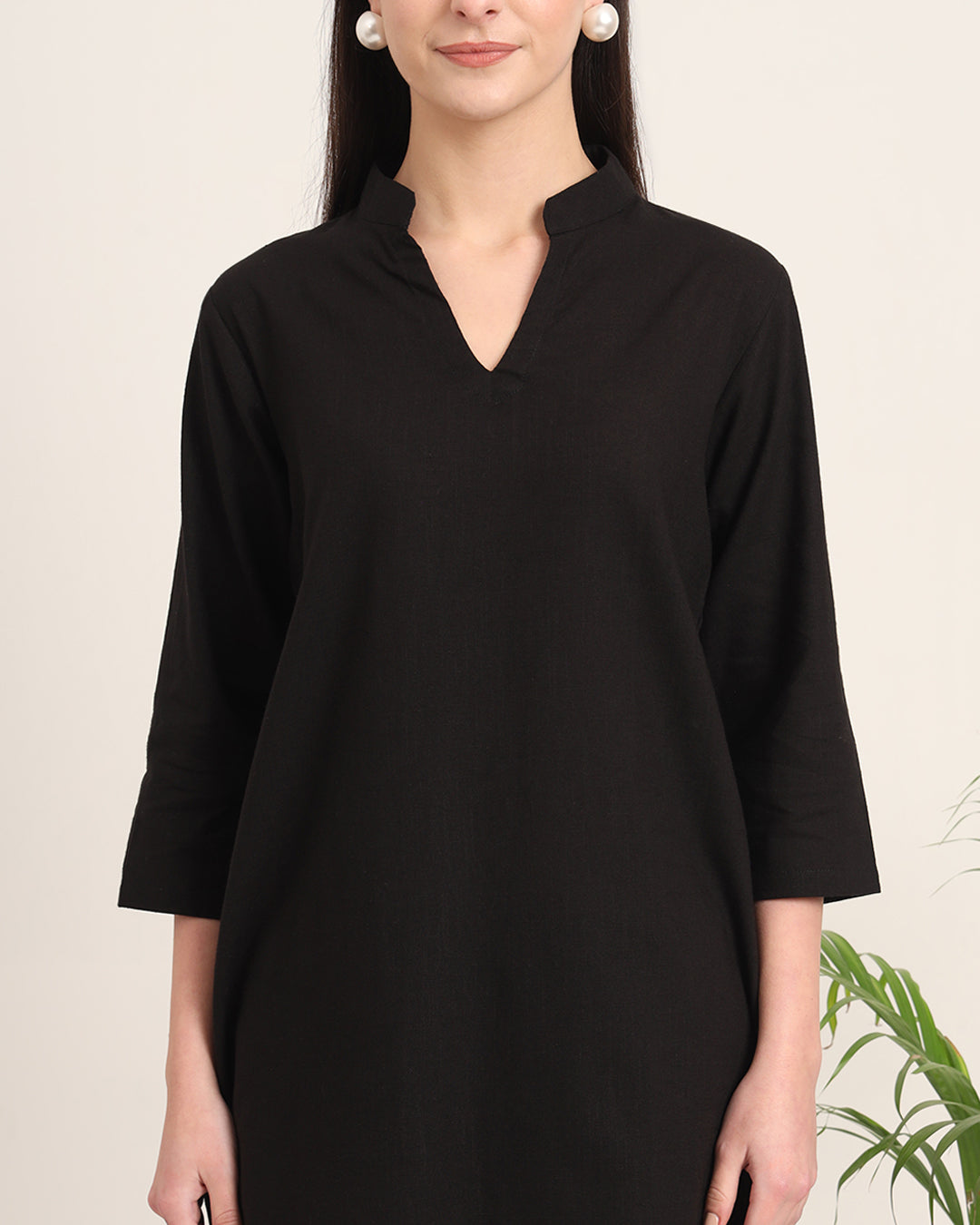 Black Collar Neck Mid Length Solid Kurta (Without Bottoms)