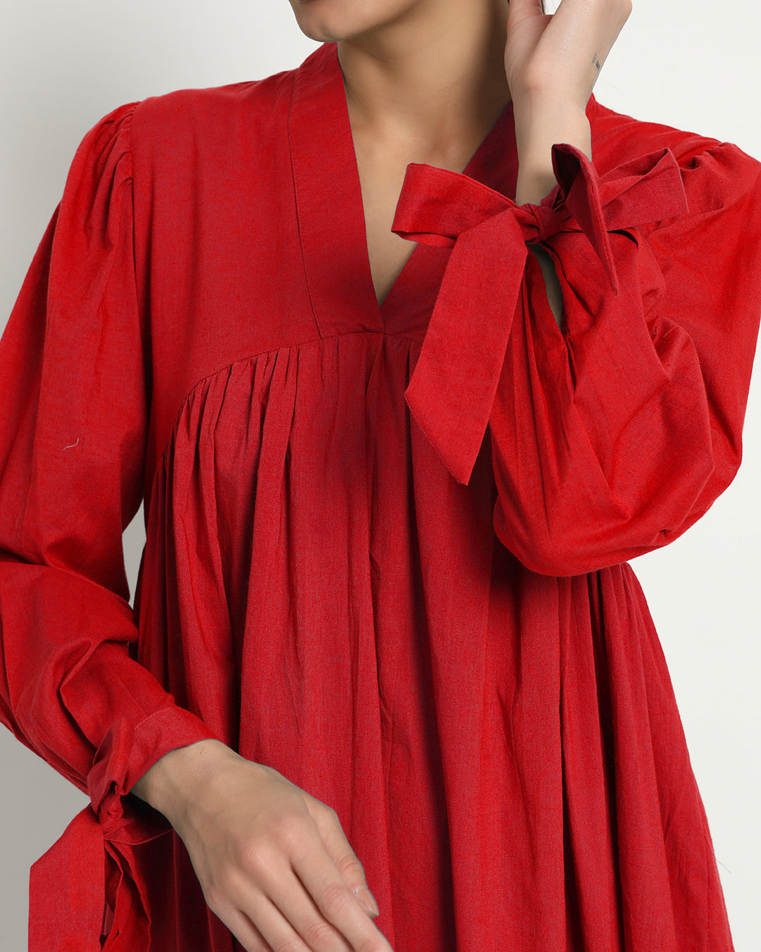 Classic Red Bowtiful Gathering V Neck Dress