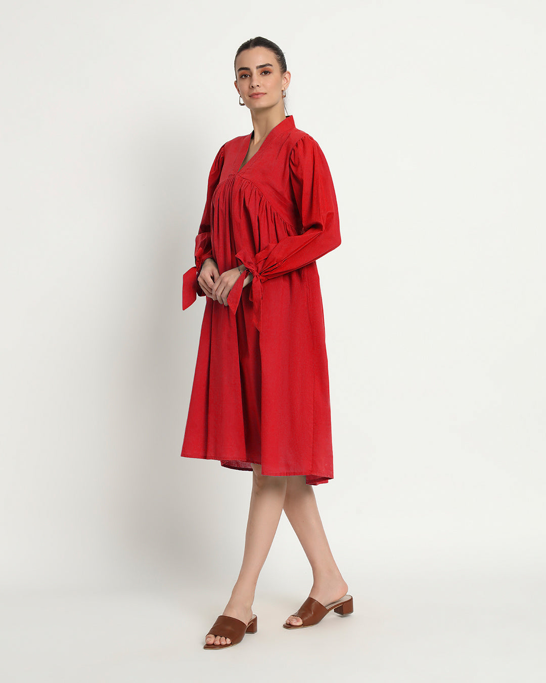 Unveiling a new realm of style: our solid gathered dresses adorned with captivating tie-up bows on the sleeves. Redefine elegance, stand out from the crowd, and make