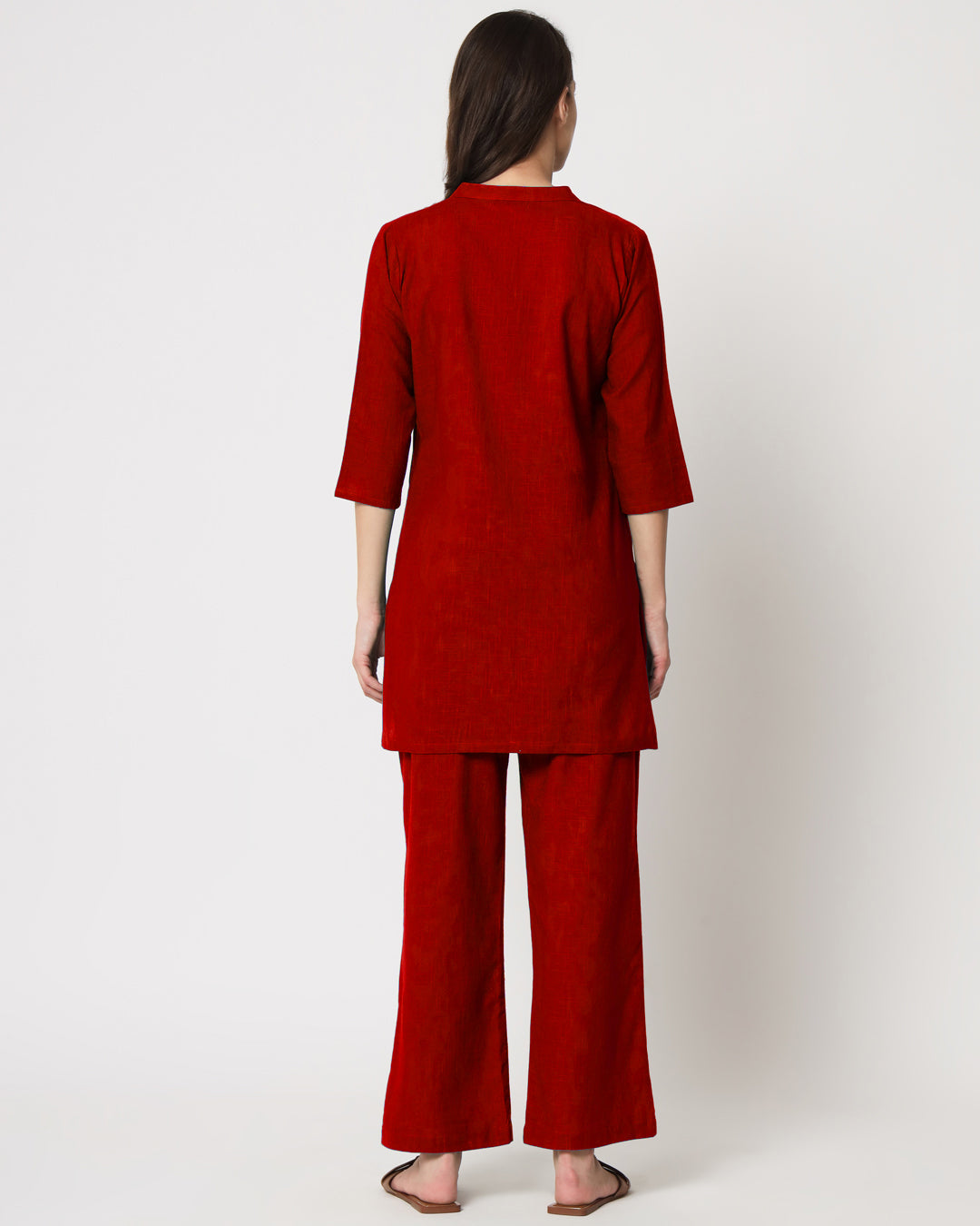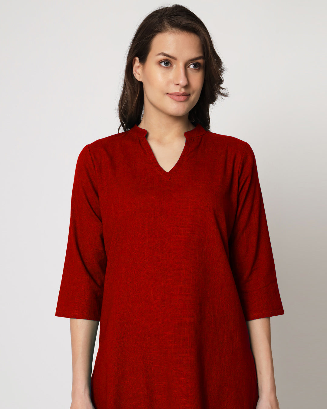 Classic Red Collar Neck Mid Length Solid Kurta (Without Bottoms)