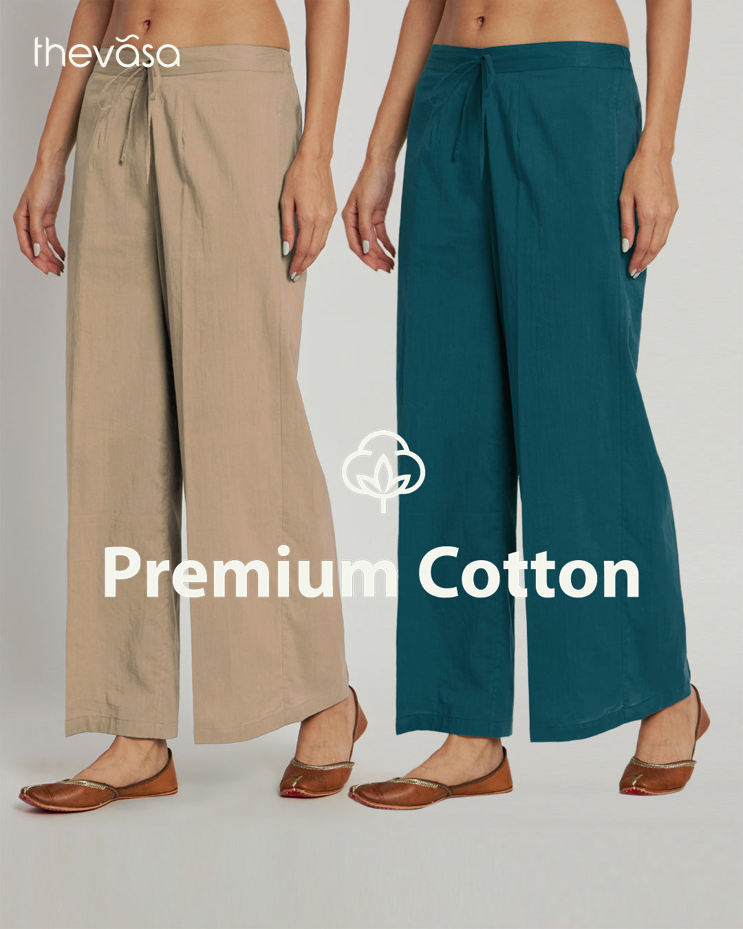 Combo: Beige & Deep Teal Wide Pants- Set Of 2