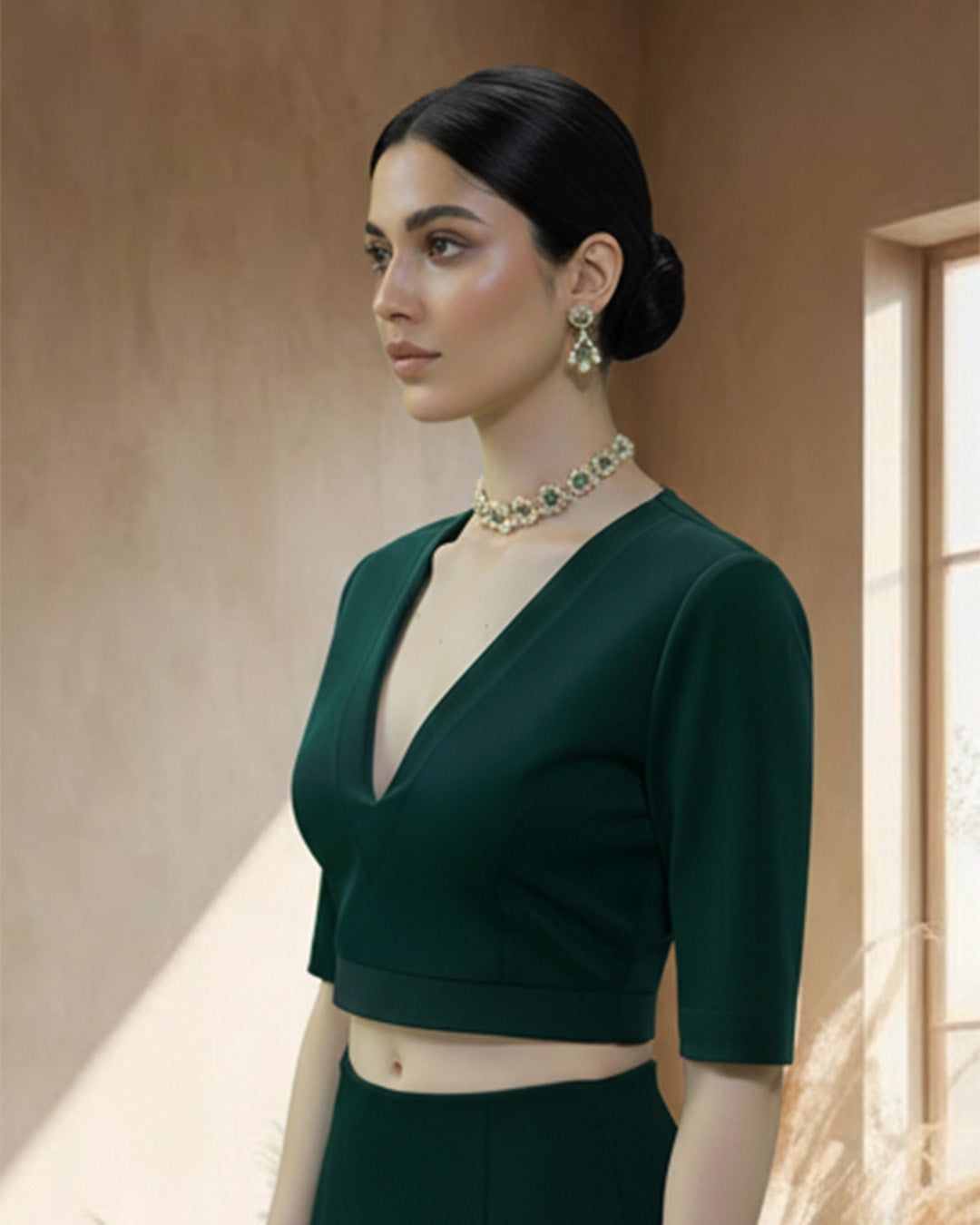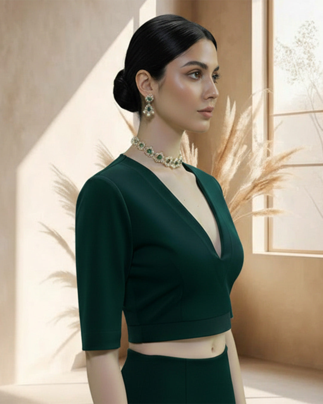 A well stitched blouse is an essential in any woman's closet. The versatility that a good fitted solid coloured blouse can bring is truly unparalleled. So go ahead and style this unique piece with your pants, trousers, skirts, Ghagras and Sarees. After all, the sky's the limit.
