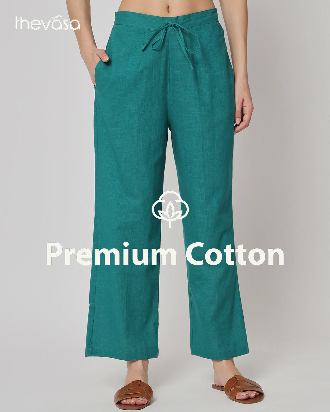 Upgrade your wardrobe with this classic presentation from Thevasa-Crafted from high grade cotton and available in a host of shades. The class and charm to these slub straight pants can go from Board meetings to house parties in minutes.