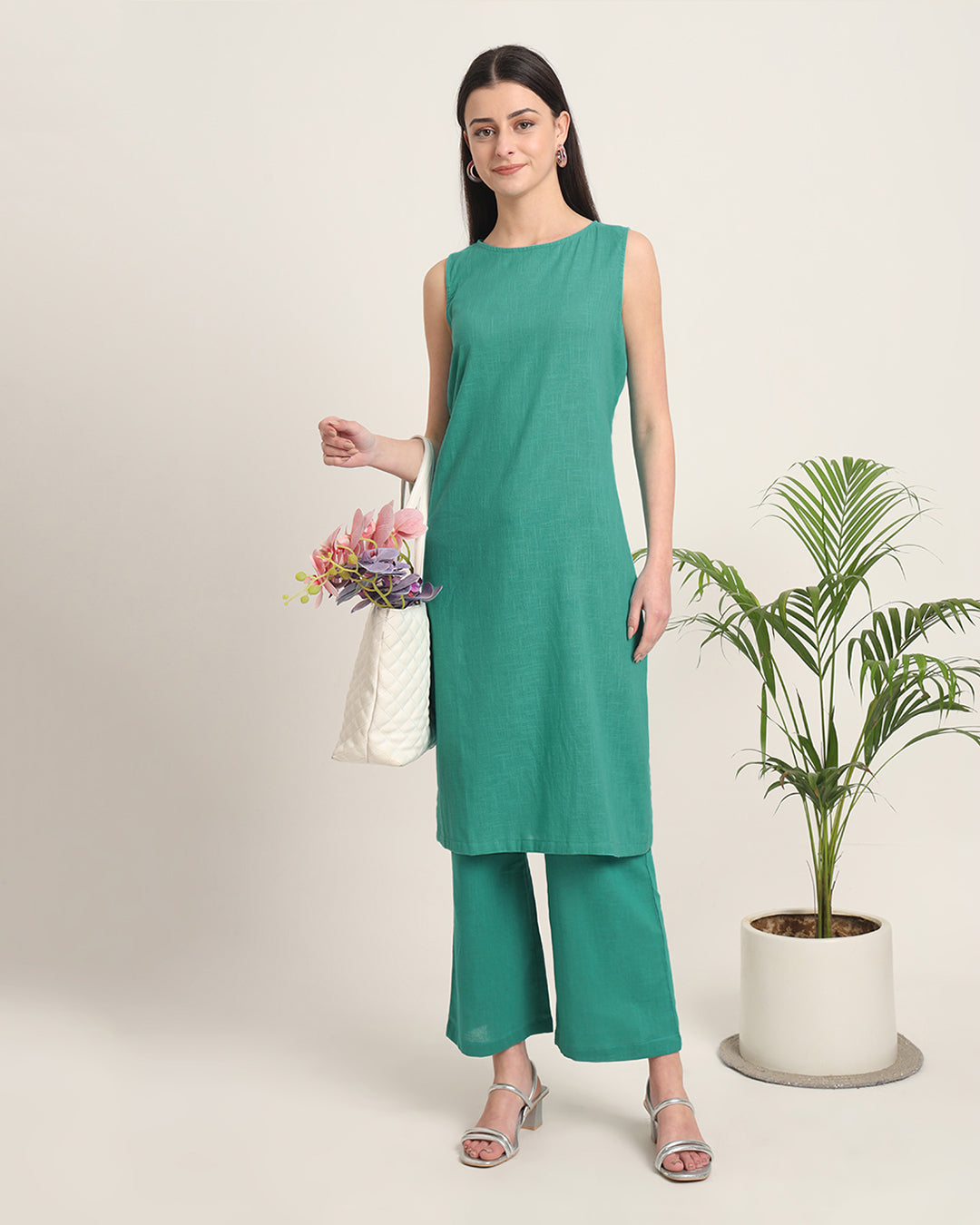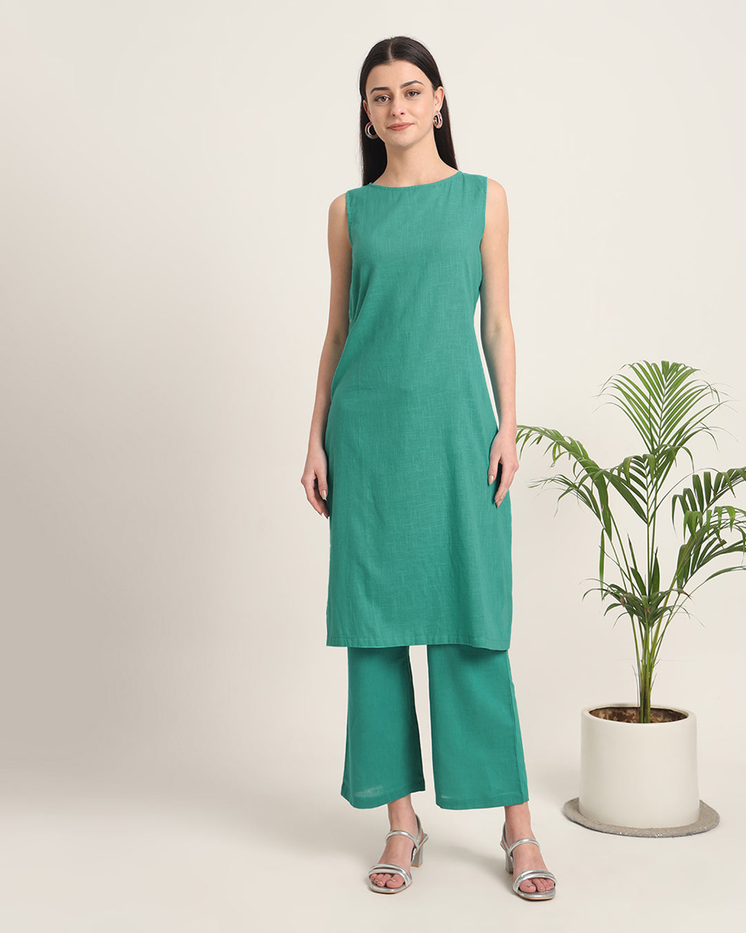 Green Gleam Sleeveless Long Length Solid Co-ord Set