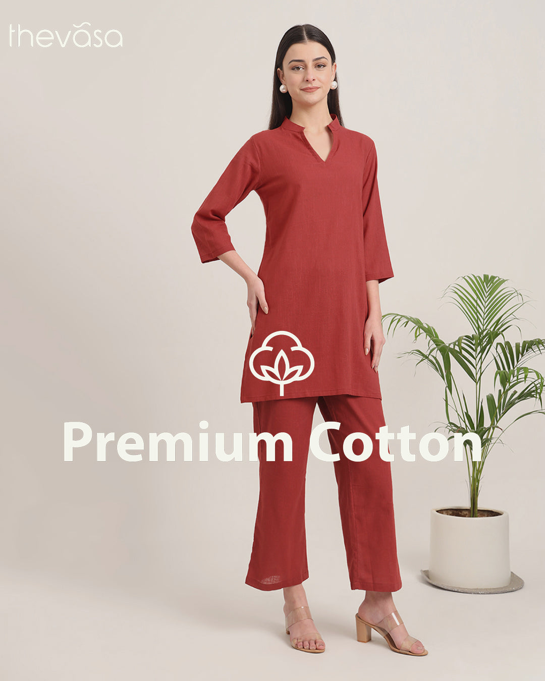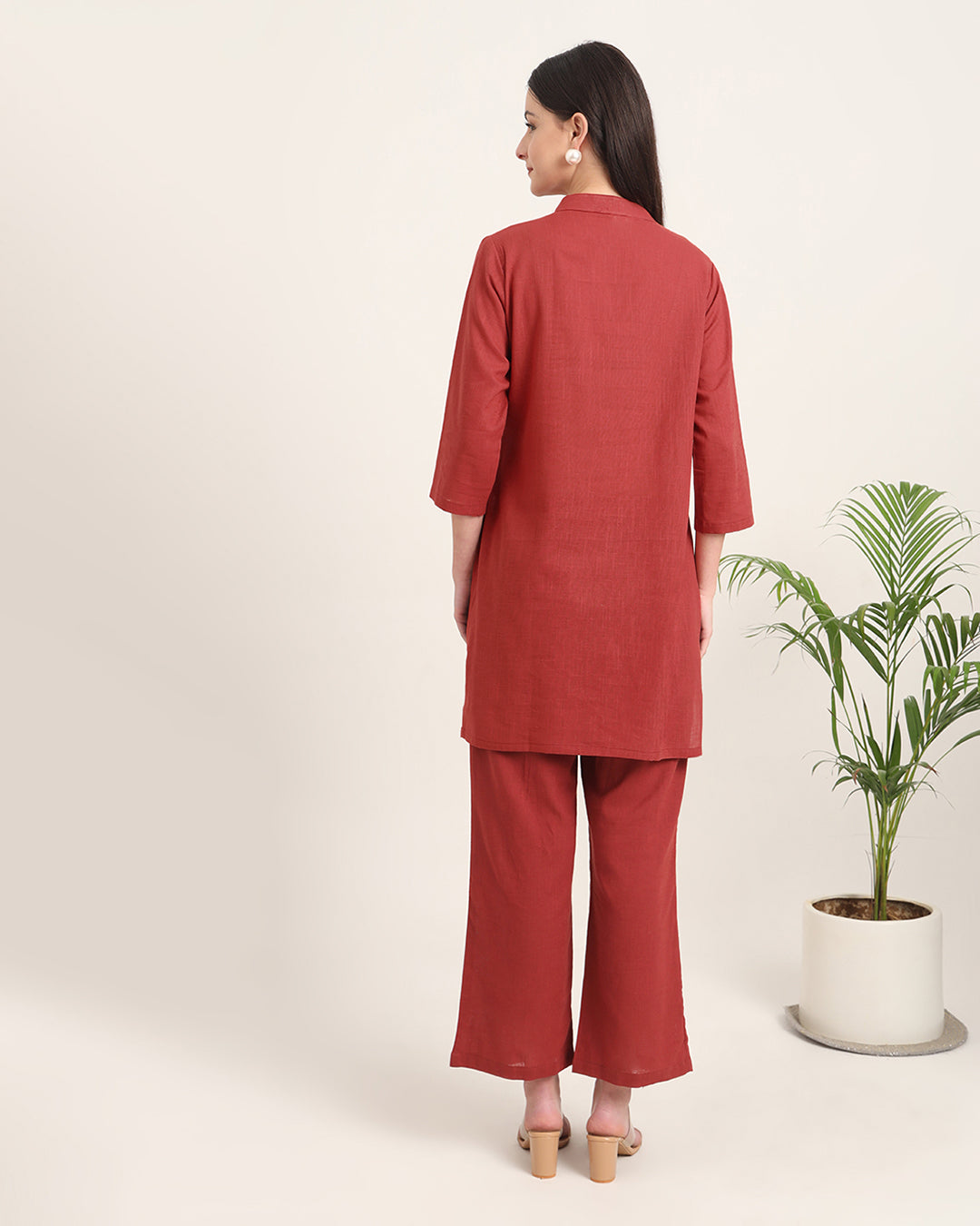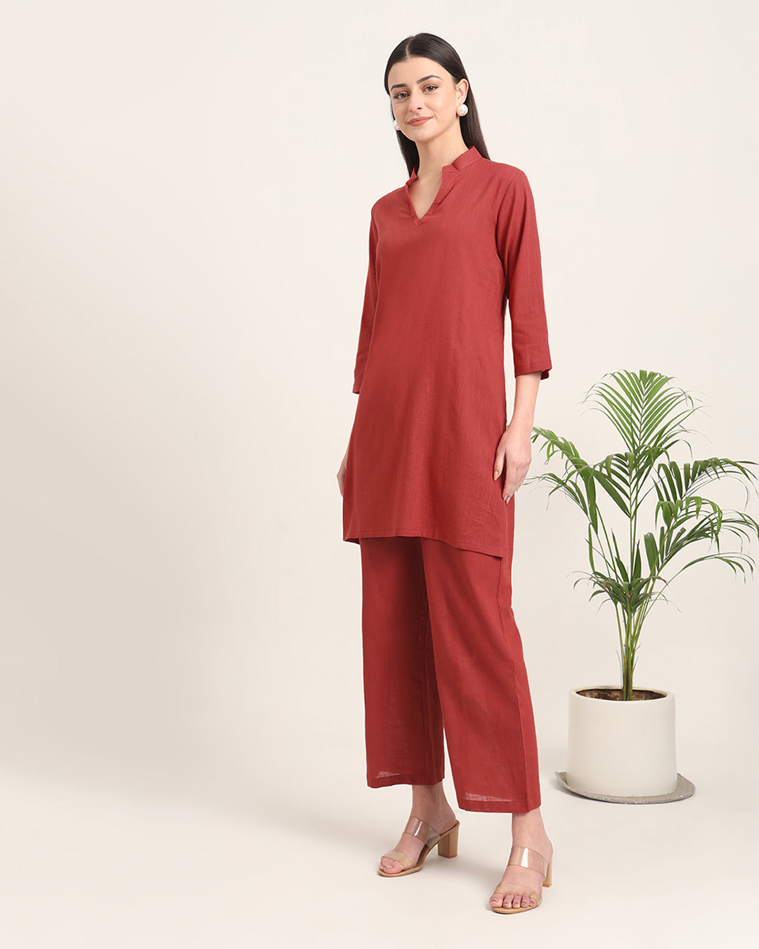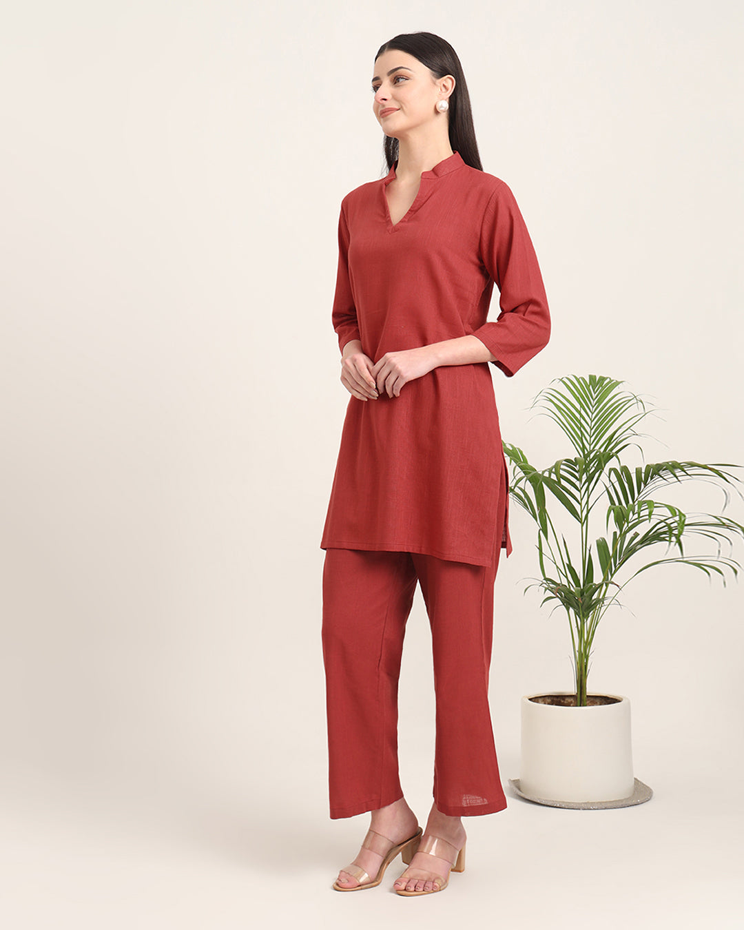 Russet Red Collar Neck Mid Length Solid Co-ord Set