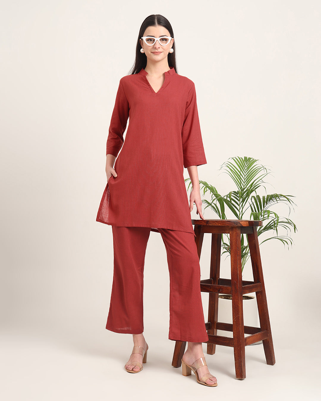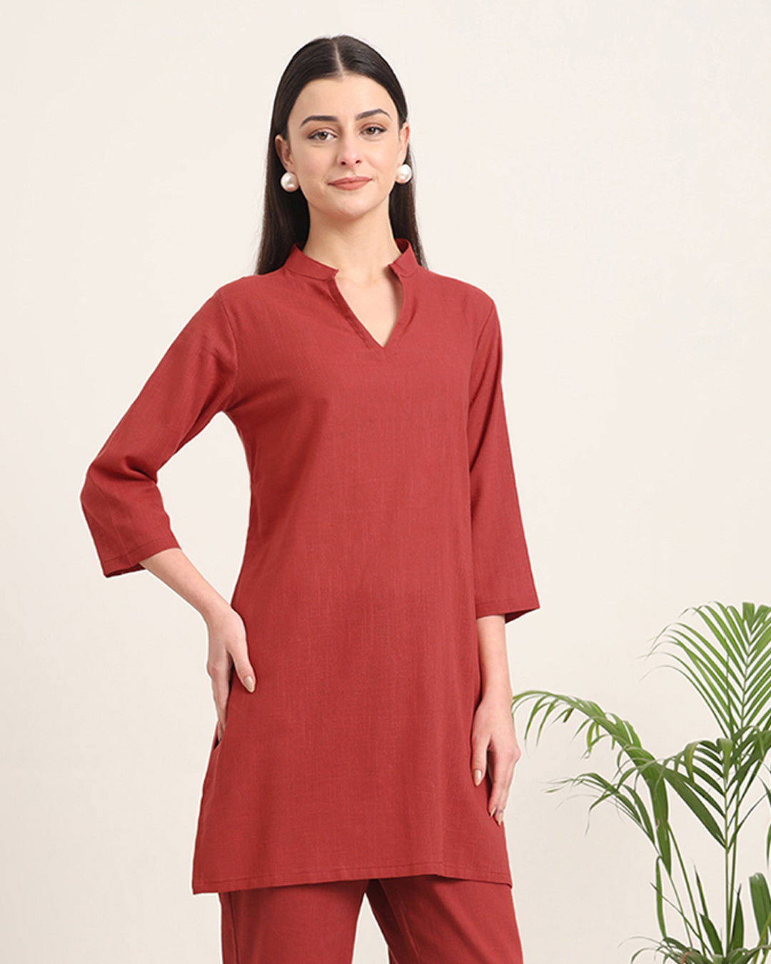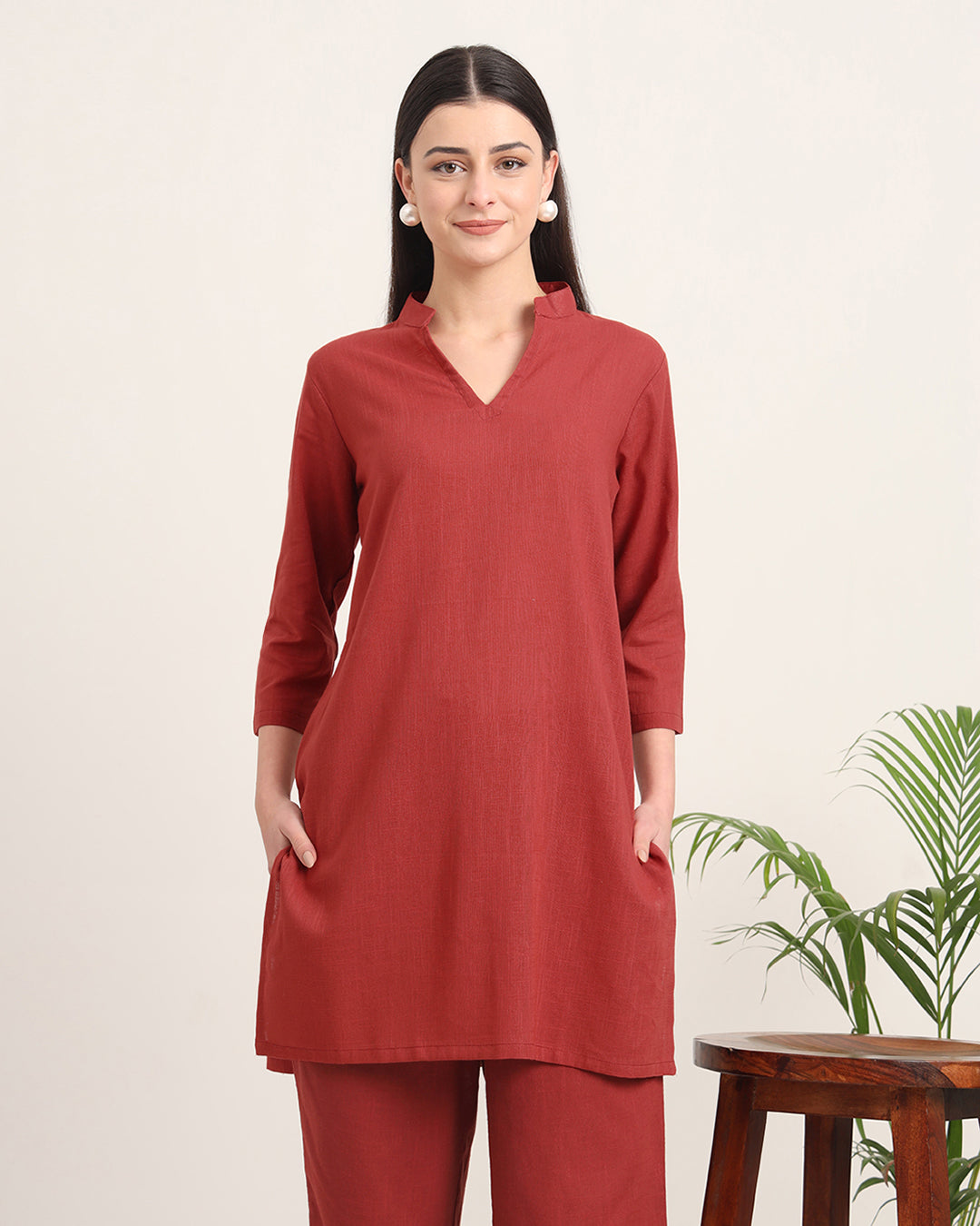 Russet Red Collar Neck Mid Length Solid Kurta (Without Bottoms)