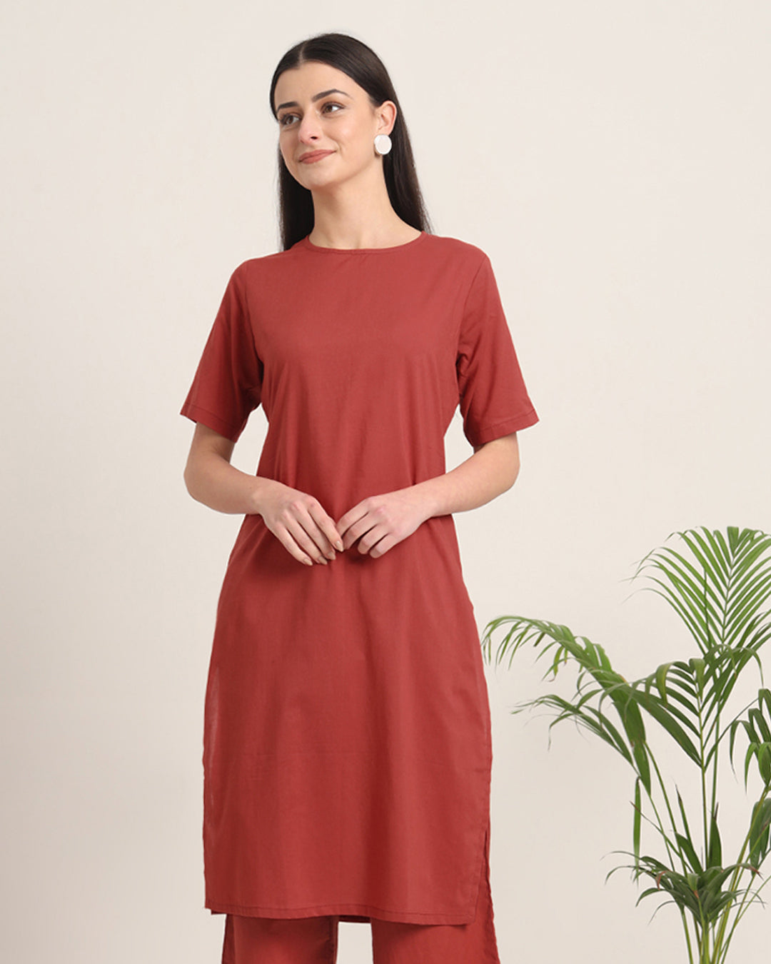 Russet Red Round Neck Long Solid Kurta (Without Bottoms)