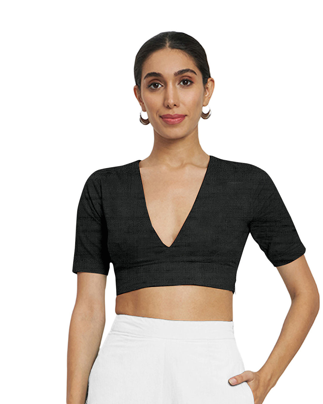 Deep V-neck crop blouse with elbow-length sleeves, perfect for traditional and contemporary outfits. Premium art silk material offering a luxurious feel and elegant sheen for special occasions.Cropped length with a fitted silhouette that accentuates natural curves and provides comfort.